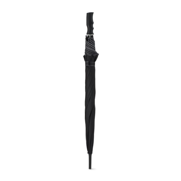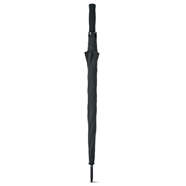 Paraguas de 23" anti-viento de apertura automática en pongis 190T con caña y costillas en fibra de vidrio y puntas de plástico negro. Paneles en negro puntadas a juego. Mango en plástico negro liso.
