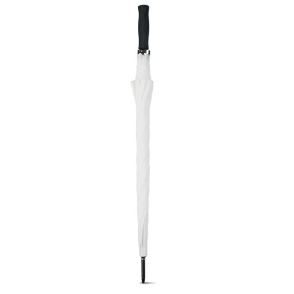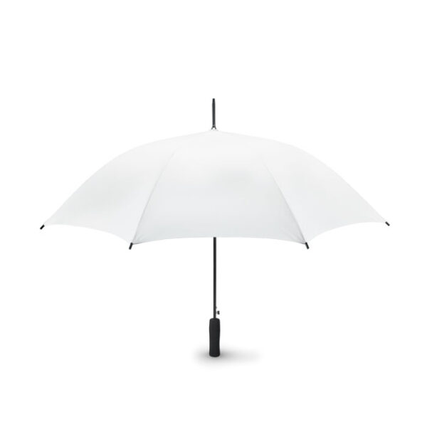 Paraguas de 30 inch con apertura manual, antiviento, con mango recto de EVA negro. Eje y costillas de fibra de vidrio, puntas de plastico. Poliéster 190T. Cierre manual.