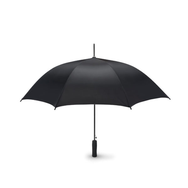 Paraguas de apertura automática en pongee 190T con caña y costillas en chapado metálico negro. Puntas en plástico negro. Mango de EVA.