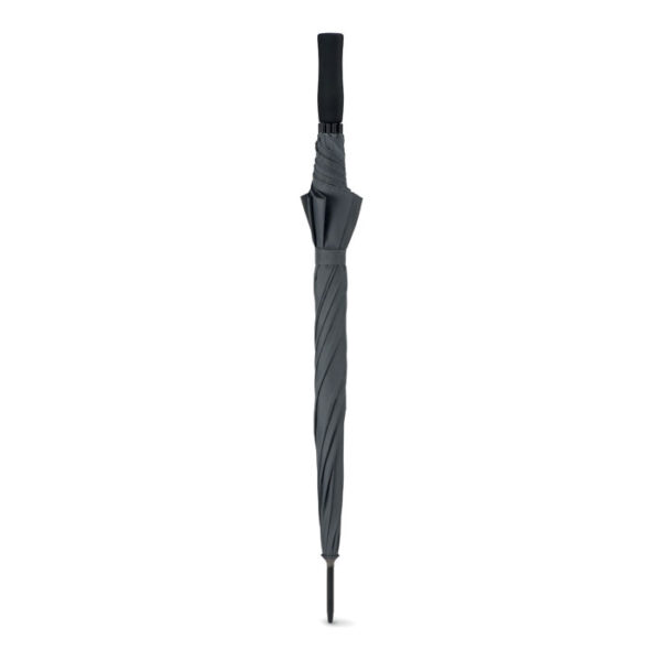Paraguas de 23'''' de apertura automática y antiviento en pongee 190T con estructura de fibra de vidrio y eje chapado en negro con puntas de plástico. Mango de ABS con acabado de goma. Cierre manual.