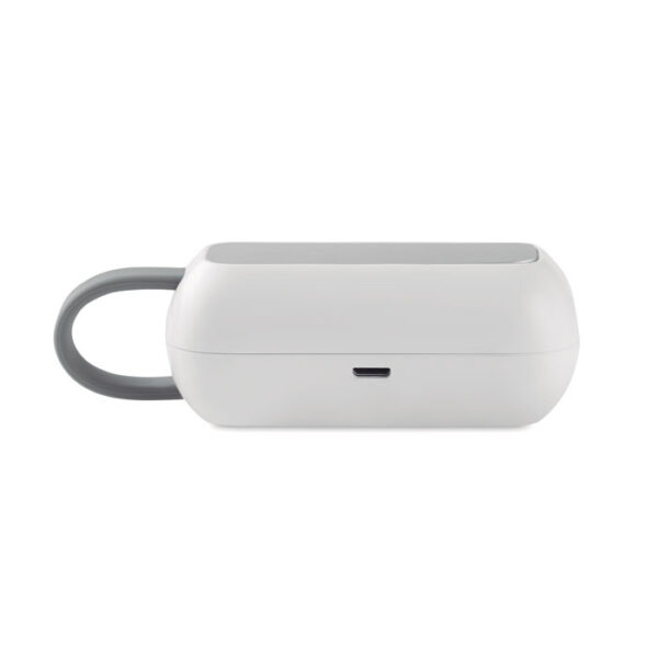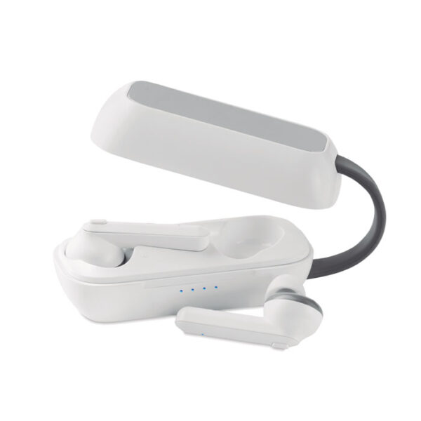 Set de 2 auriculares estéreo inalámbricos TWS 5.0 con micrófono y batería integrada de 30 mAh. Tiempo de reproducción aproximado de 3 horas. Emparejamiento automático. Incluye un cable de carga micro USB. Presentado en una caja de carga inalámbrica que también actúa como estación de carga con batería de 400 mAh.