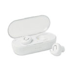 Set de 2 auriculares estéreo inalámbricos TWS 5.0 con micrófono y batería integrada de 30 mAh. Tiempo de reproducción aproximado de 3 horas. Emparejamiento automático. Incluye un cable de carga micro USB. Presentado en una caja de carga inalámbrica que también actúa como estación de carga con batería de 400 mAh.