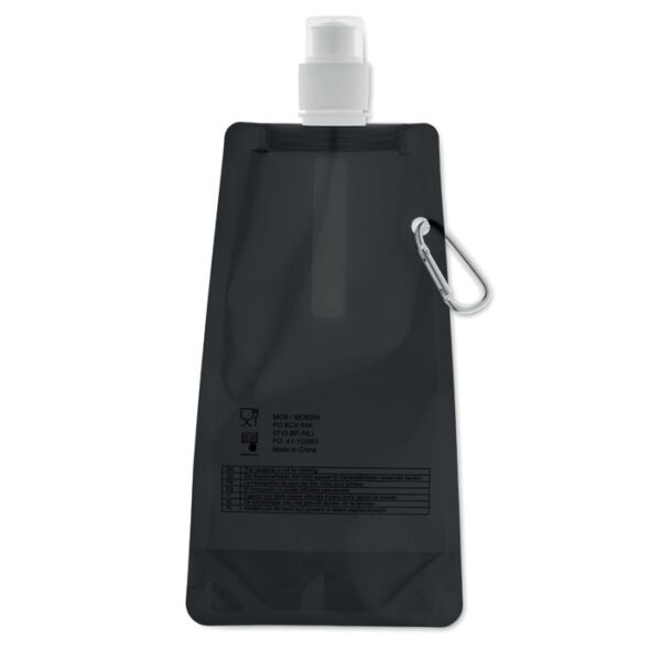 Botella de agua plegable en PET sin BPA con mosquetón de aluminio. Capacidad 480 ml. Anti fugas.