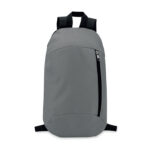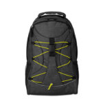 Mochila de poliéster 600D jaspeada con revestimiento de colores contrastantes y cordón decorativo en la parte frontal. Bolsillos de malla en ambos lados.