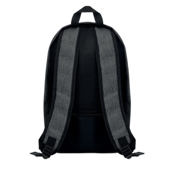 Mochila en poliéster 600D jaspeada y correas acolchadas. Cremallera de compartimento principal en parte interna para una mayor protección.