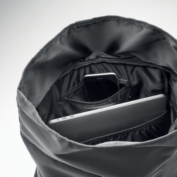 Mochila con cierre roll top en poliéster 600D RPET con respaldo acolchado y refuerzo inferior. Bolsillo frontal con cremallera. El forro es de RPET 210D RPET.