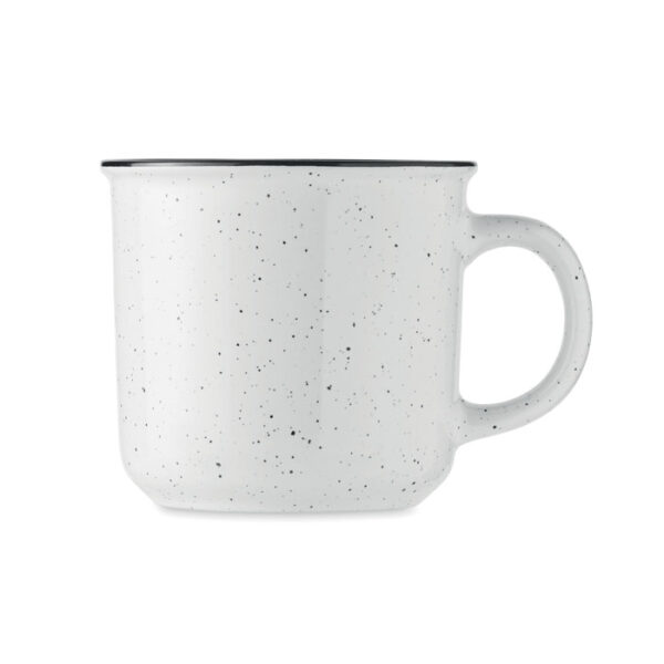 Taza grande de cerámica de estilo vintage. Debido al patrón de manchas, éstas serán visibles en el logotipo impreso. Capacidad: 400 ml.