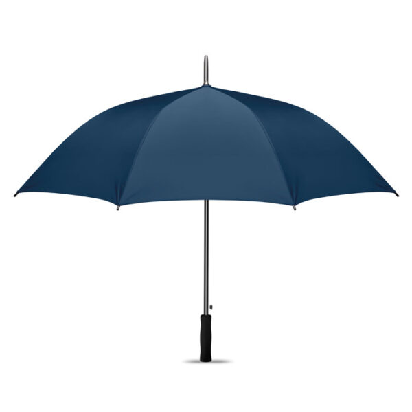 Paraguas de 27 »apertura automática en material de poliéster 190T y recubrimiento en plata interior. Eje y varillas en chapado metálico negro. Puntas de plástico negro y mango EVA negro recto. Cierre manual.