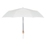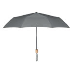 Paraguas plegable de 21», plegable en 3 partes. Pongee de 190T RPET, marco y varillas chapado metálico negro y mango de madera. Apertura y cierre manuales. Funda de pongee.